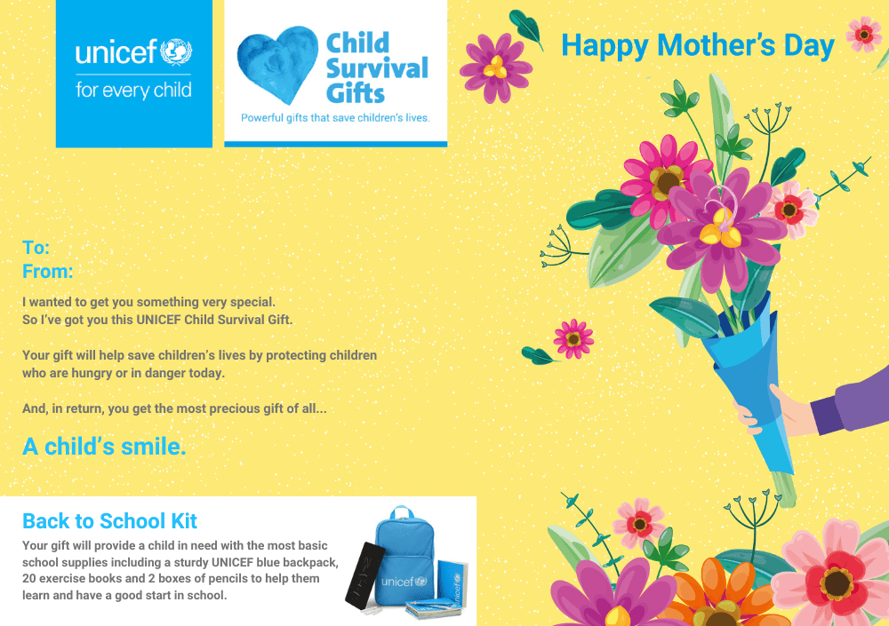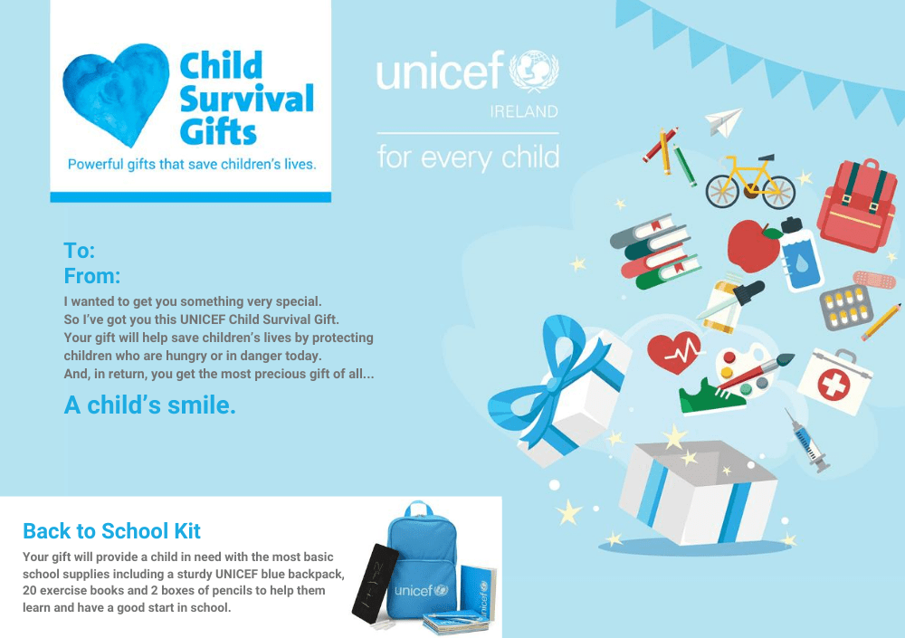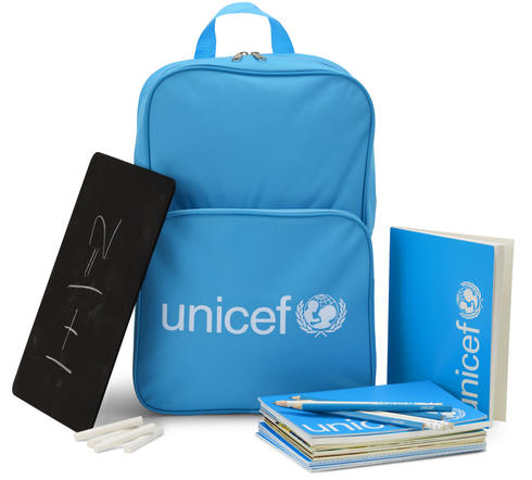 Your gift will provide a child in need with essential school supplies including a sturdy UNICEF blue backpack, 20 exercise books and 2 boxes of pencils to help them learn and have a good start in school.