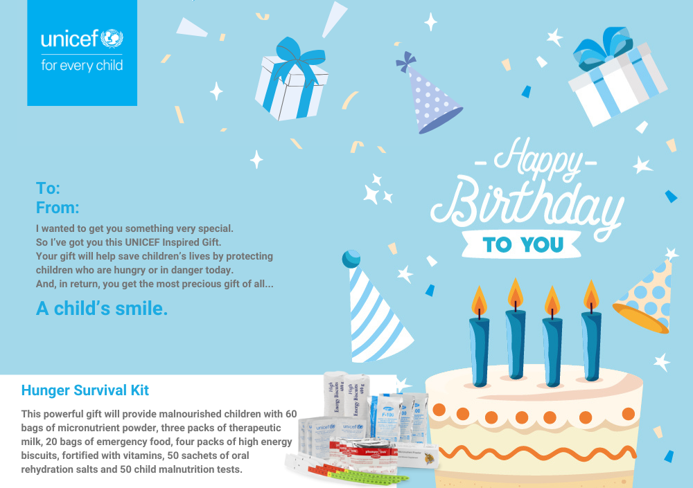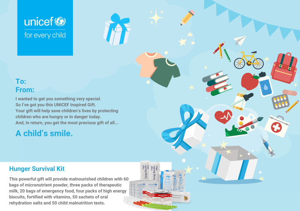 This powerful gift will be a life-saver. It will provide malnourished children with 60 bags of micronutrient powder, 3 packs of therapeutic milk, 20 bags of emergency food, 4 packs of high energy biscuits fortified with vitamins, 50 sachets of oral rehydration salts and 50 child malnutrition tests – the best way to spot malnutrition in children, and save their lives.