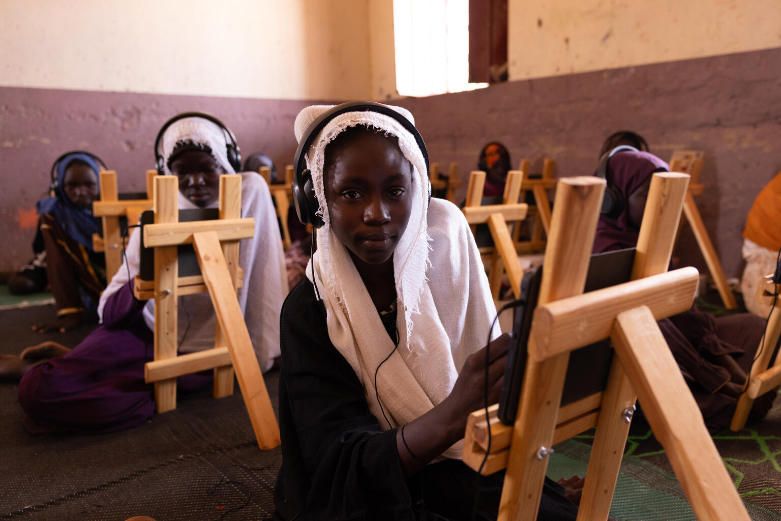 Seven-year-old Aya sits very still on her first ever day of school. She’s never been in a classroom before because conflict forced her family to flee and school was no longer an option.